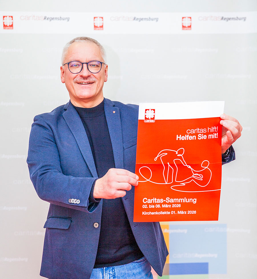Diözesan-Caritasdirektor Michael Weißmann präsentiert das Plakat zur Caritas Frühjahrssammlung 2026, Fotograf: OchCaritas hilft – Helfen Sie mit