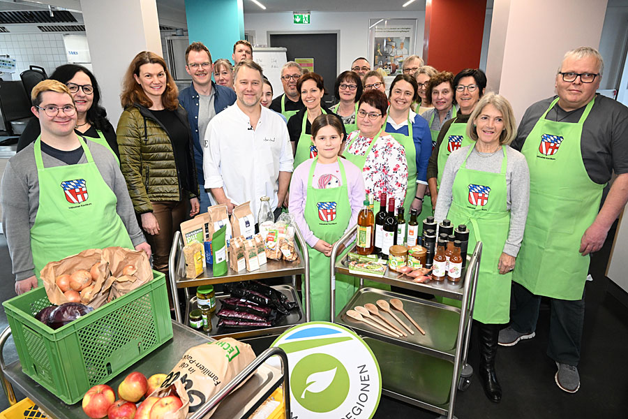 Groß war das Interesse an den Kochkursen mit Sternekoch Anton Schmaus (Bildmitte). Foto: H.C. WagnerAuf der Homepage des Landratsamtes Regensburg ist außerdem eine digitale Version des Kurs-Begleithefts zu finden unter www.landkreis-regensburg.de (Rubrik Bürgerservice – Hilfen in schwierigen Lebenslagen – Beratung & Unterstützung – Umsetzung des Aktionsplanes Inklusion und Beratung für Menschen mit Behinderung) oder unter folgendem Link: